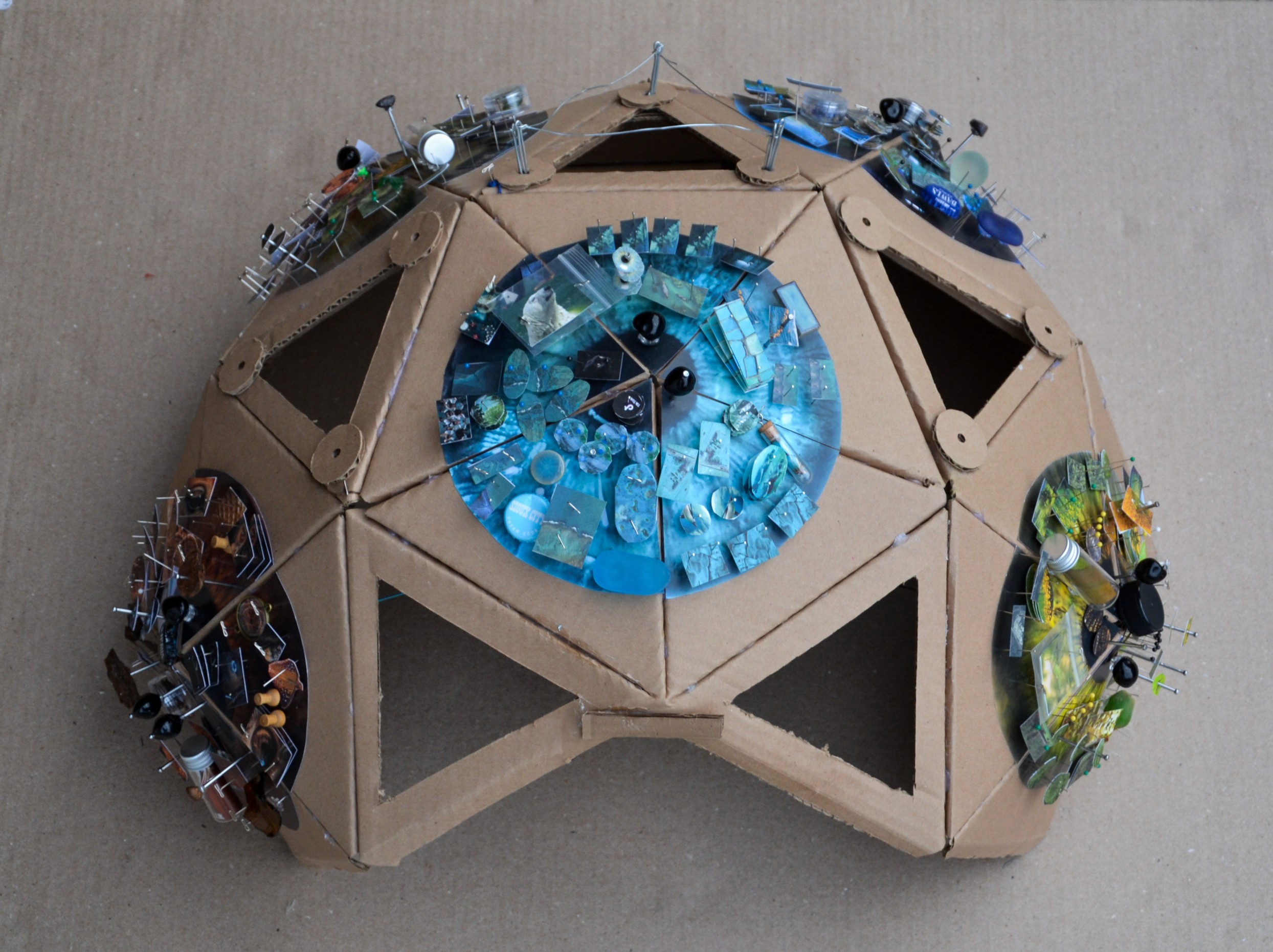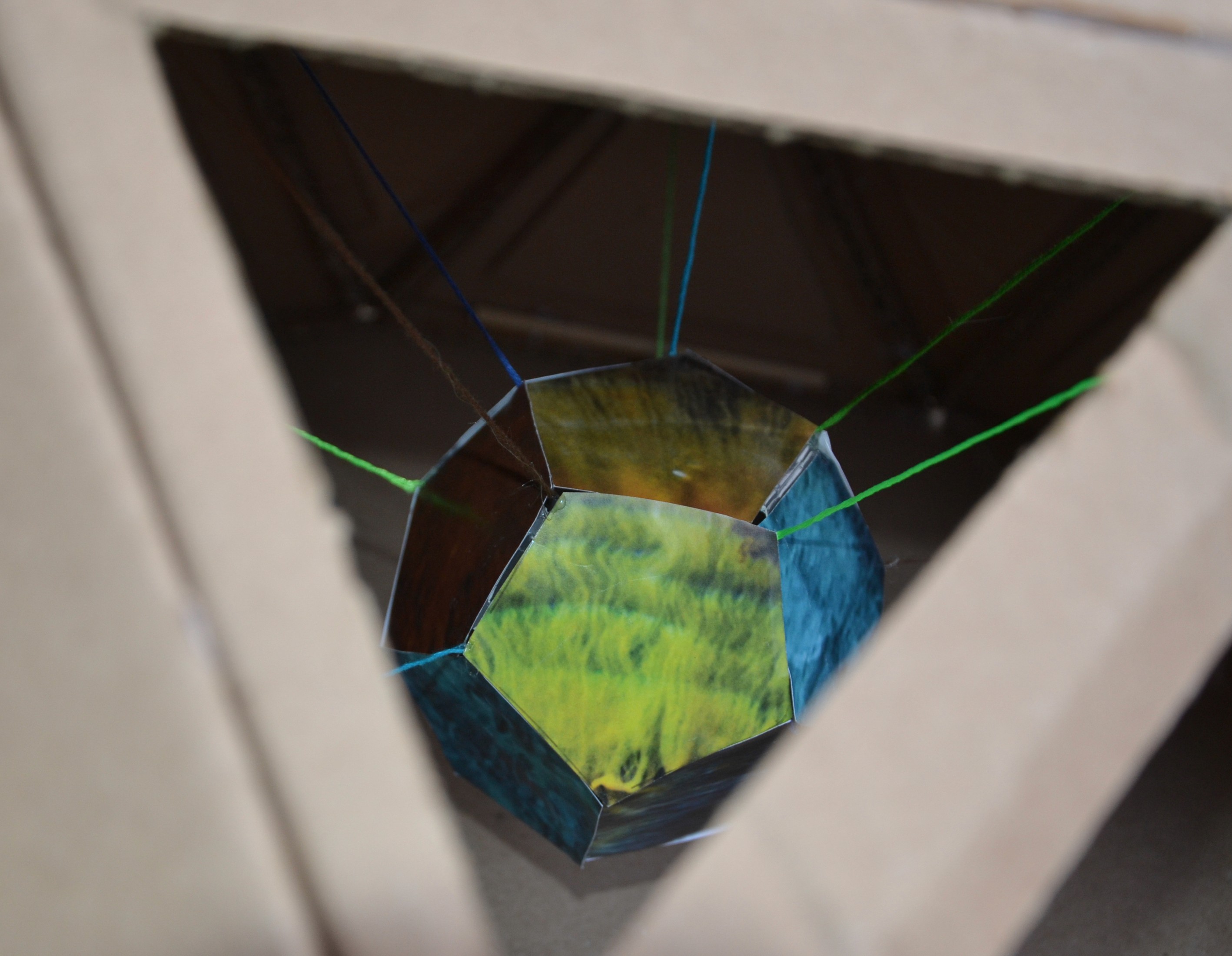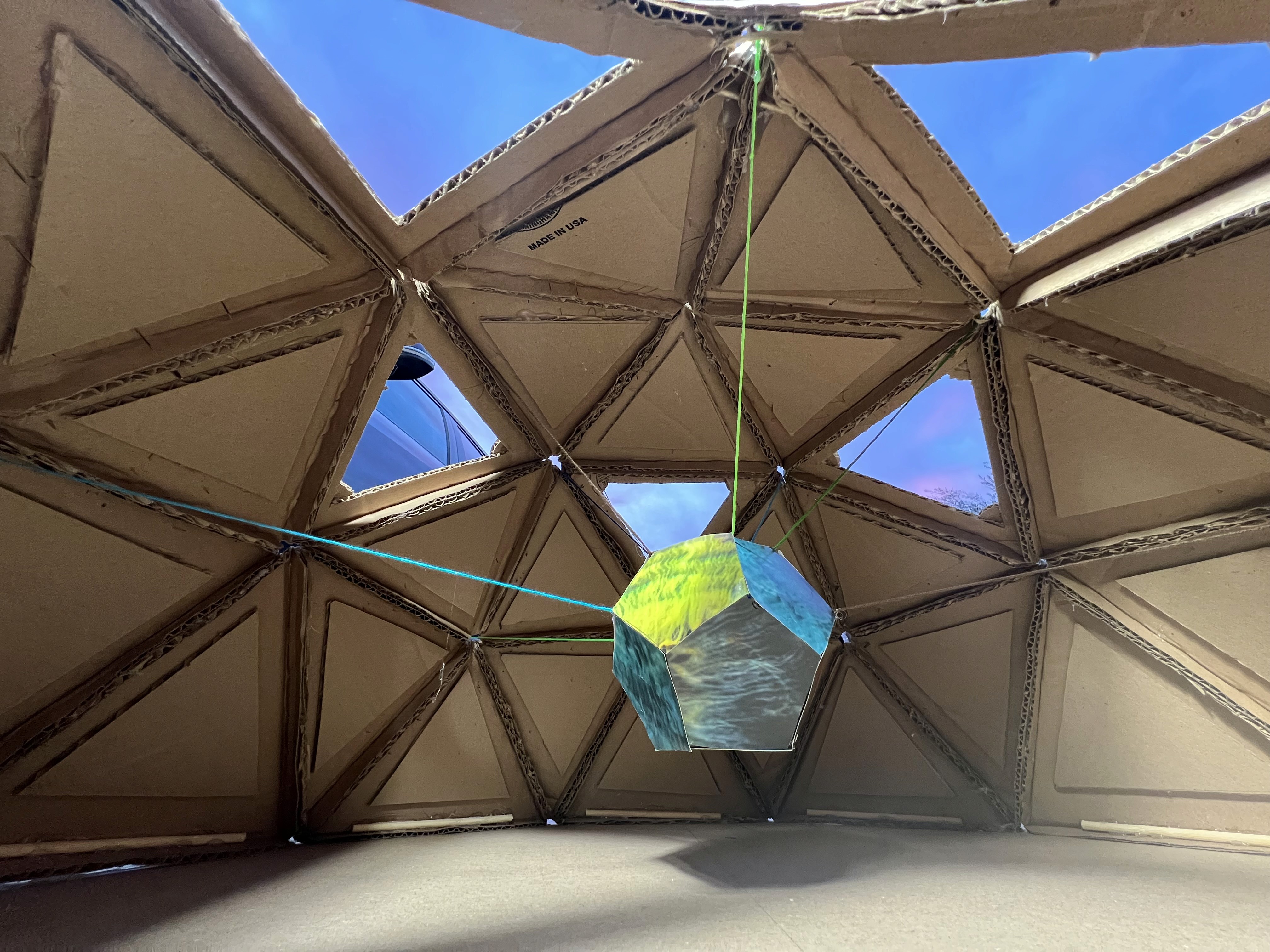 This project began with the fabrication of 38 cardboard triangles (both isosceles and equilateral) which were used to construct a geodesic dome.
