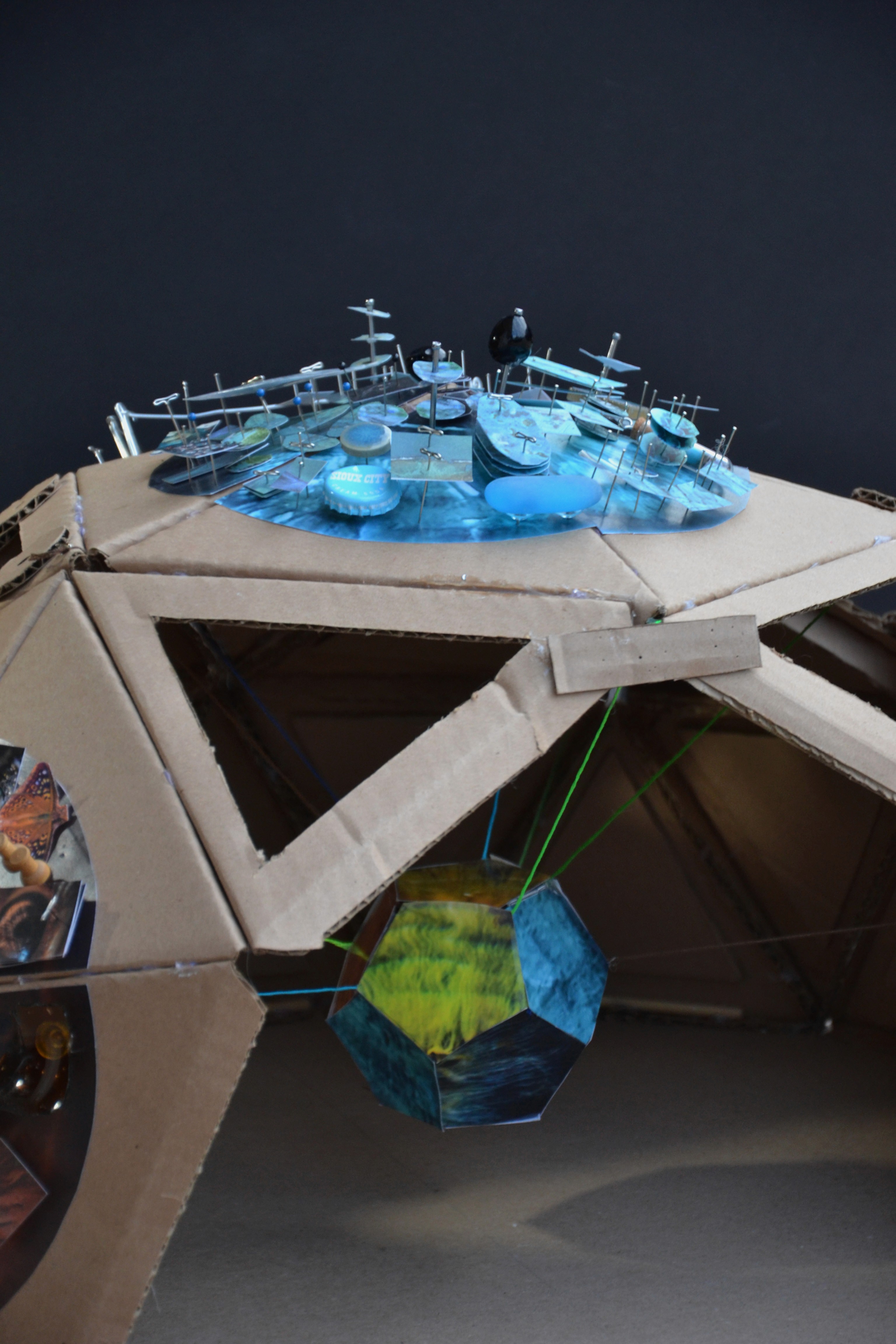 The exterior of the dome is covered with large eyes made from found materials and photographs of everyday imagery—scenes from the news, moments in nature, and other visual symbols. These fragmented images create a chaotic surface that represent the current world, saturated with media and conflict. The inside on the other hand is refined; uniform strings attach to each eye, subtle triangles for light to filter in.
