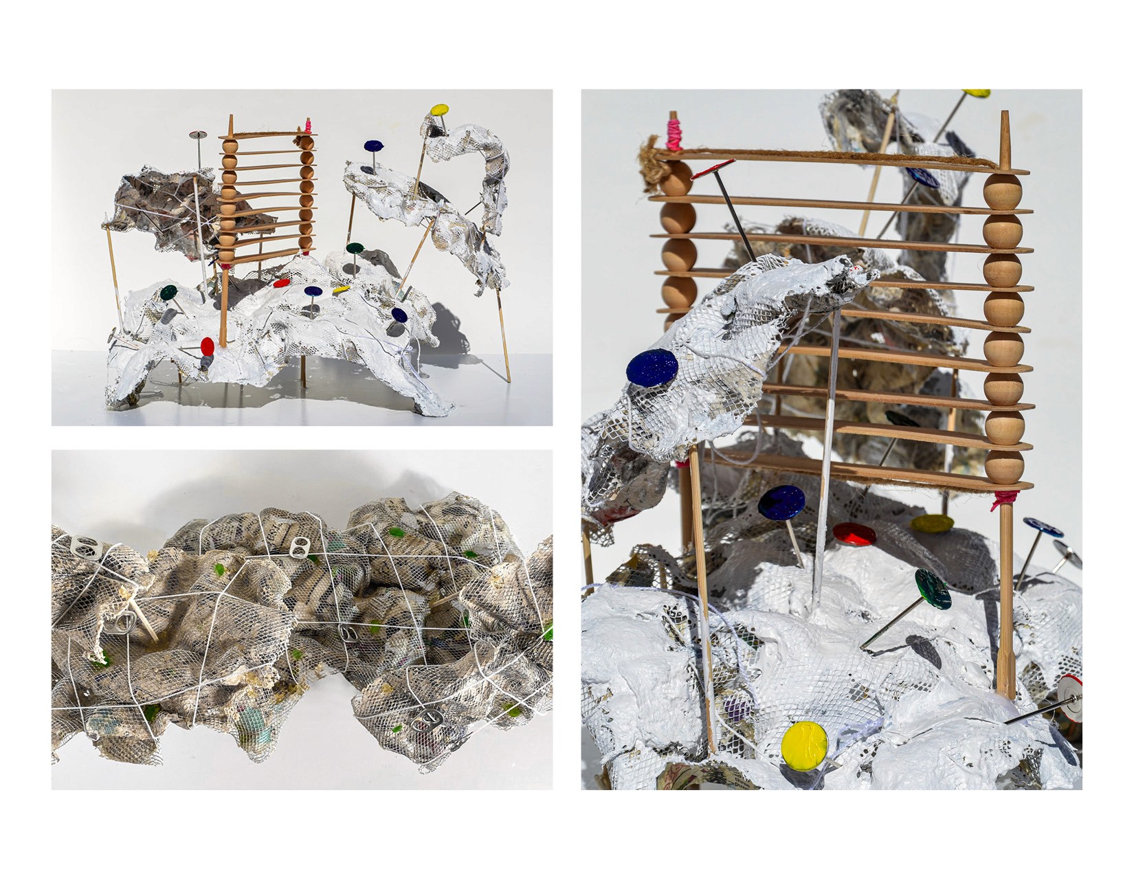 This project began with pieces of wire mesh that have been coated with newspaper, clay, and paint. Together, these organic structures resemble pieces of trash that have been piled onto one another. Within this dense mass, certain elements like pins and a wooden structure punctuate the surface at varying heights, ultimately drawing viewers attention away from the surface and rather to those extruding markers.