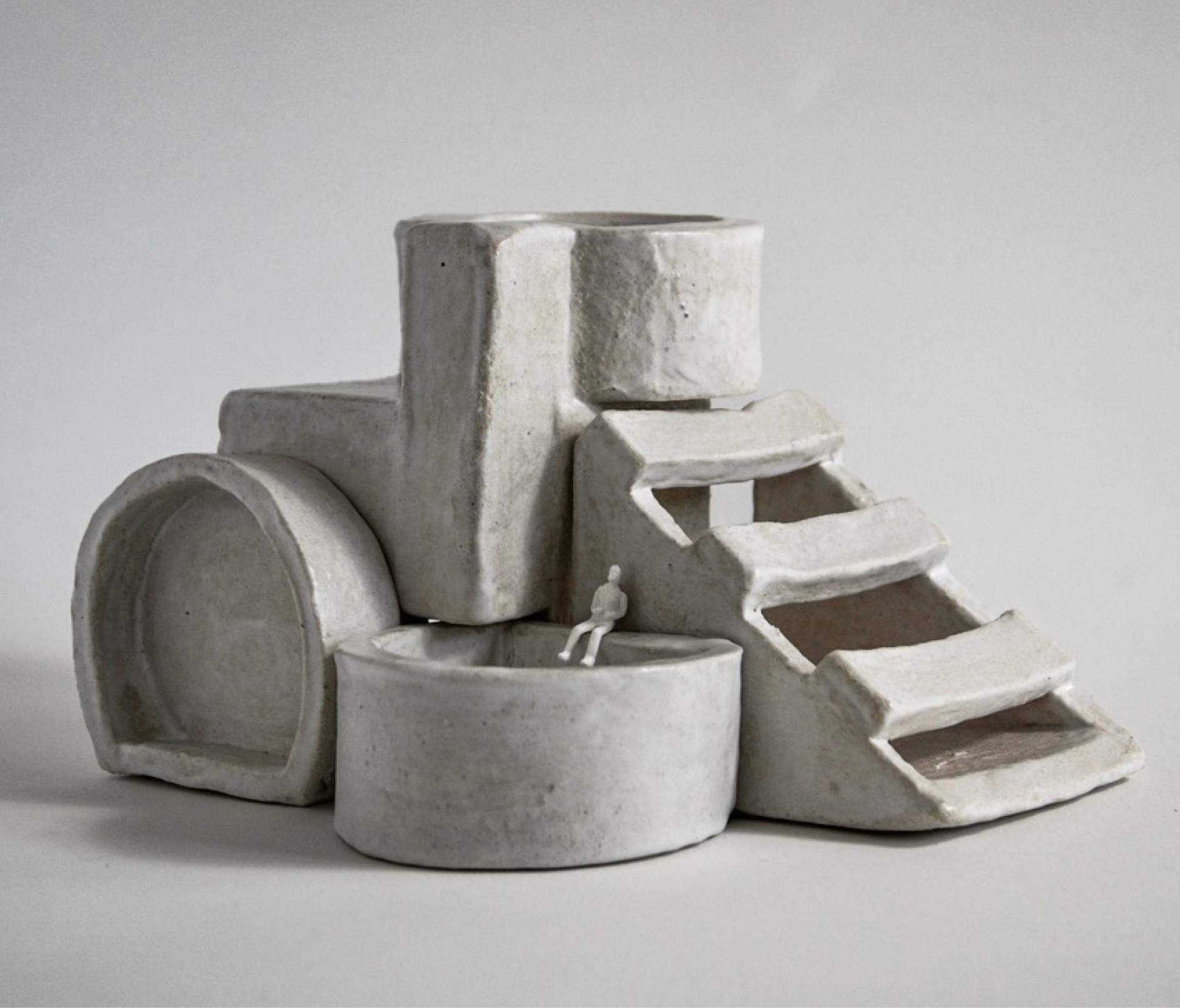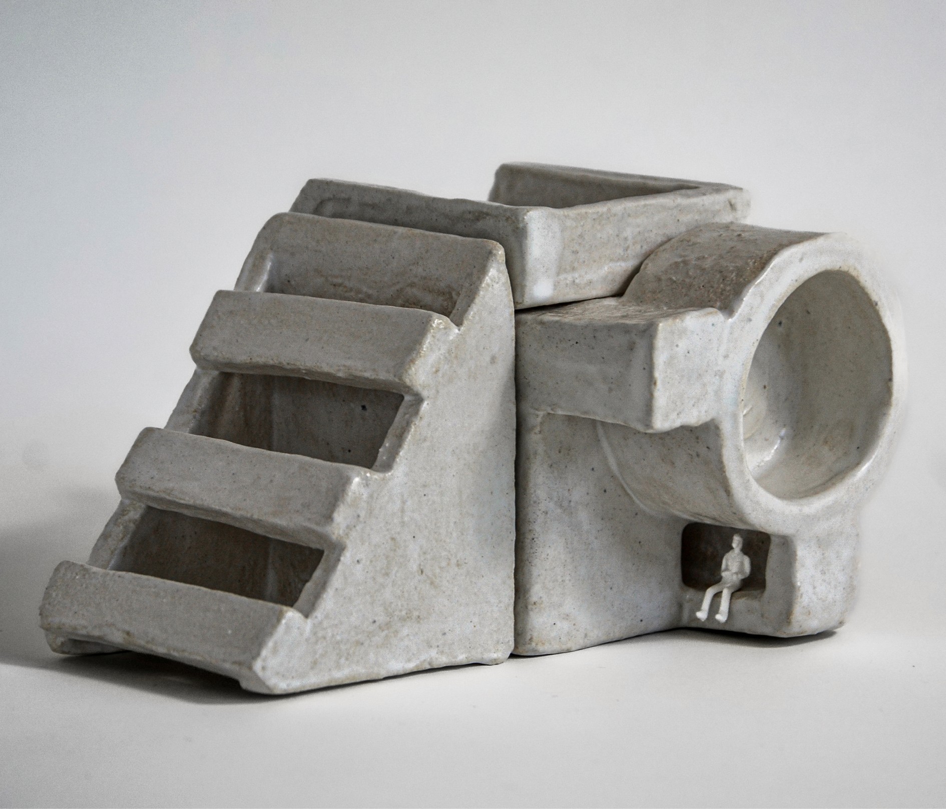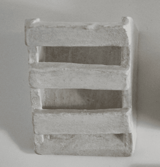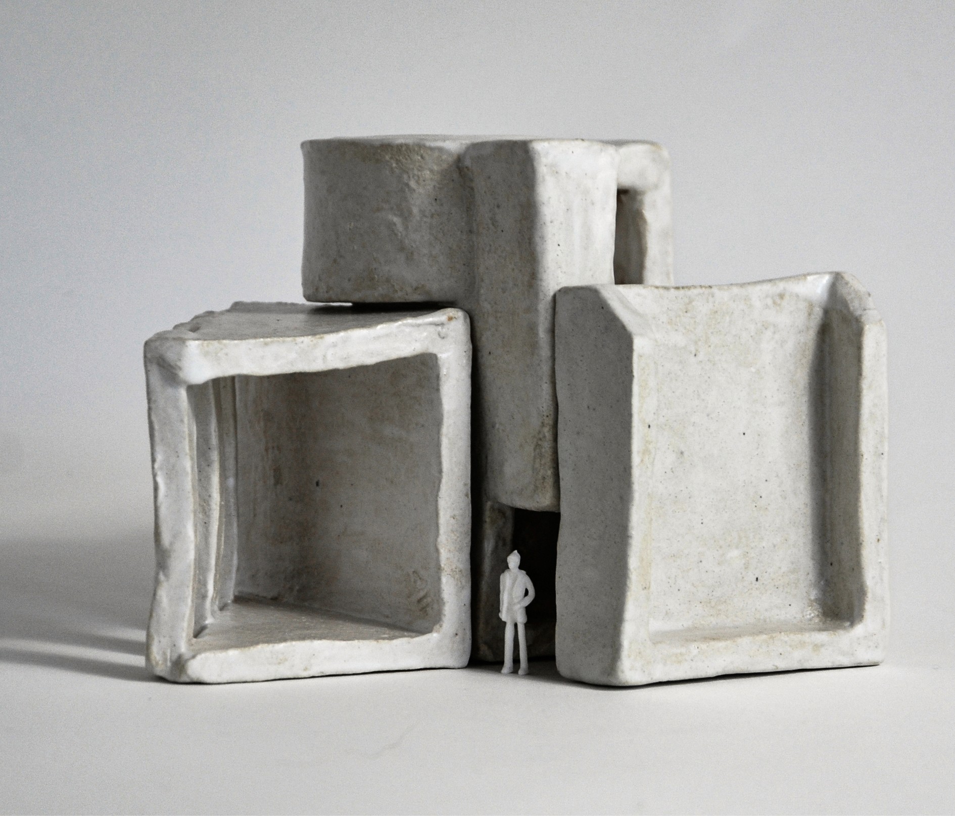Sculpted in clay, and finished in a refined white glaze, this piece carries a quiet sense of "play." The creation of these blocks brought with it the recall of early childhood memories: stacking wooden blocks and creating sculptures out of them. The tactile nature of the forms reinforces a nostalgic appeal.