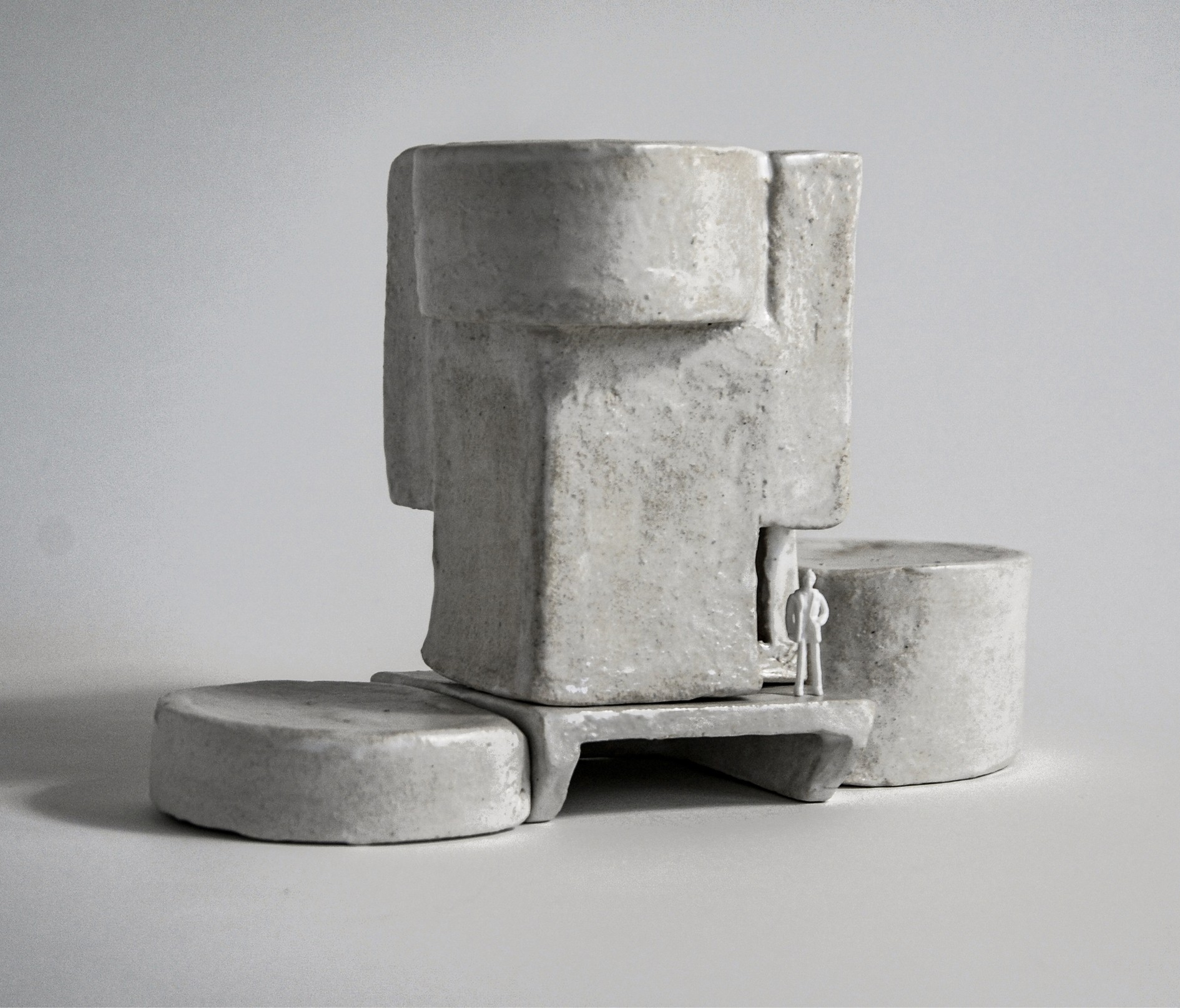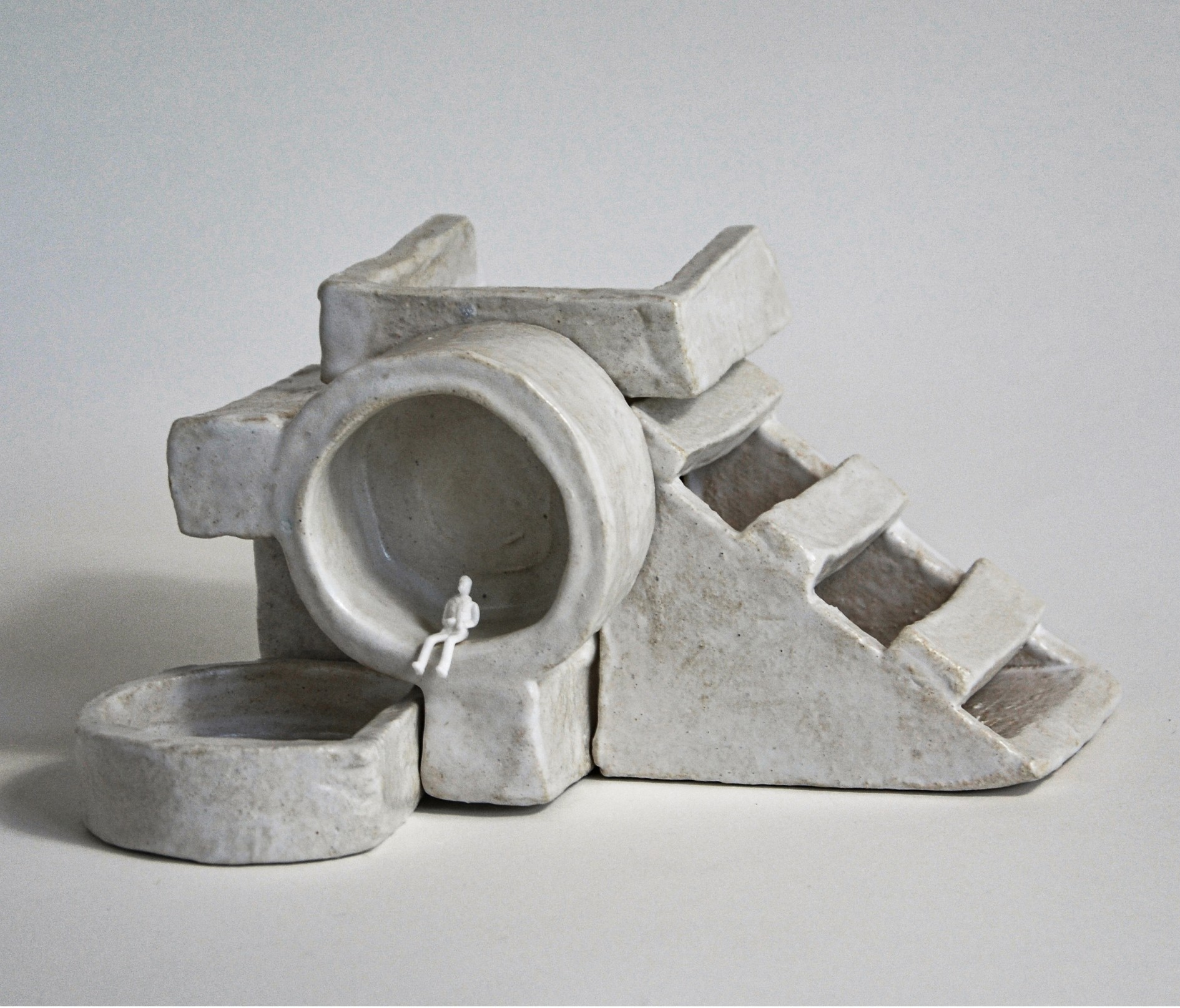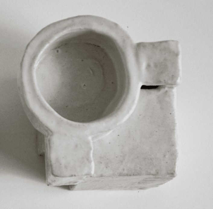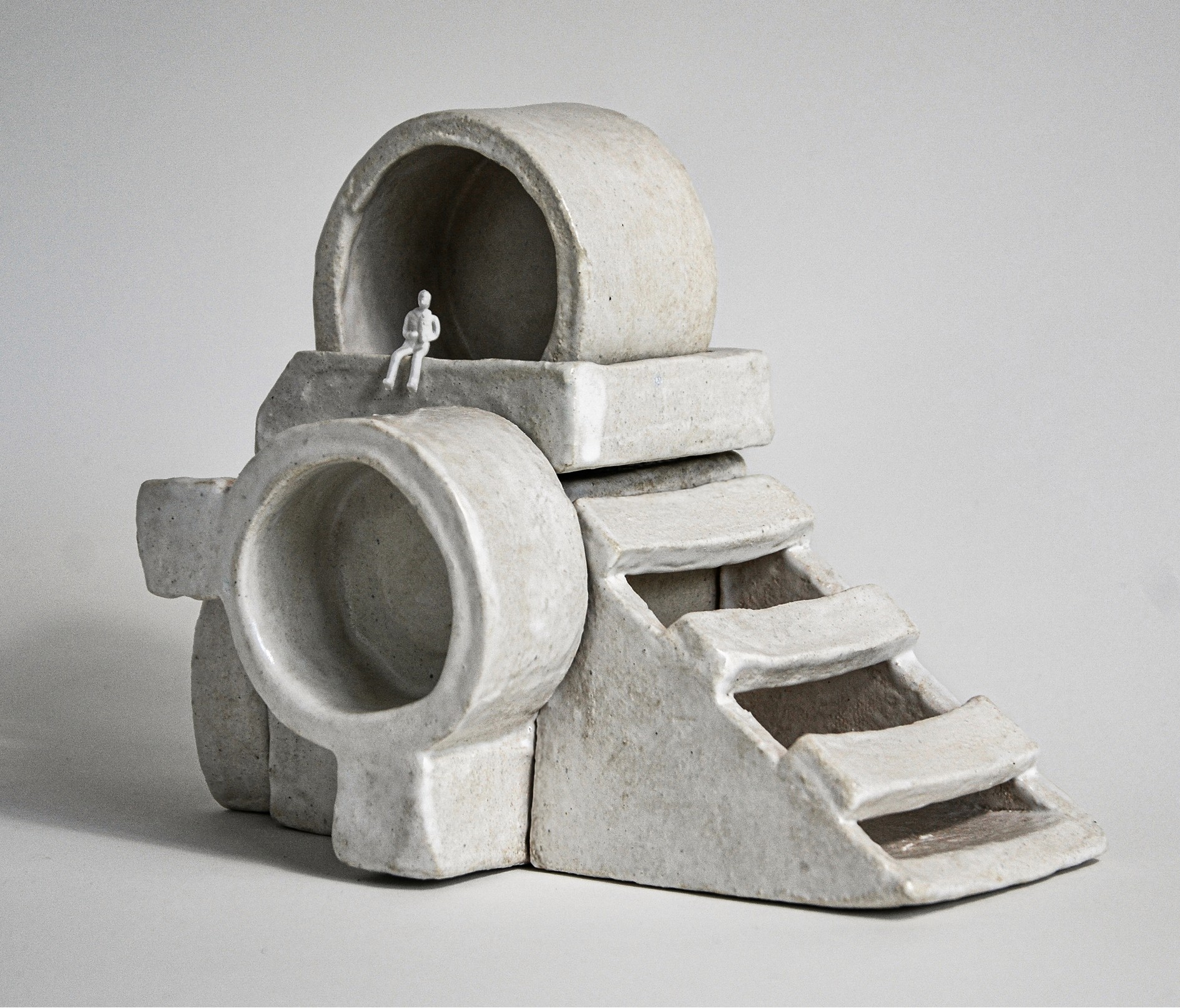 Sculpted in clay, and finished in a refined white glaze, this piece carries a quiet sense of "play." The creation of these blocks brought with it the recall of early childhood memories: stacking wooden blocks and creating sculptures out of them. The tactile nature of the forms reinforces a nostalgic appeal.