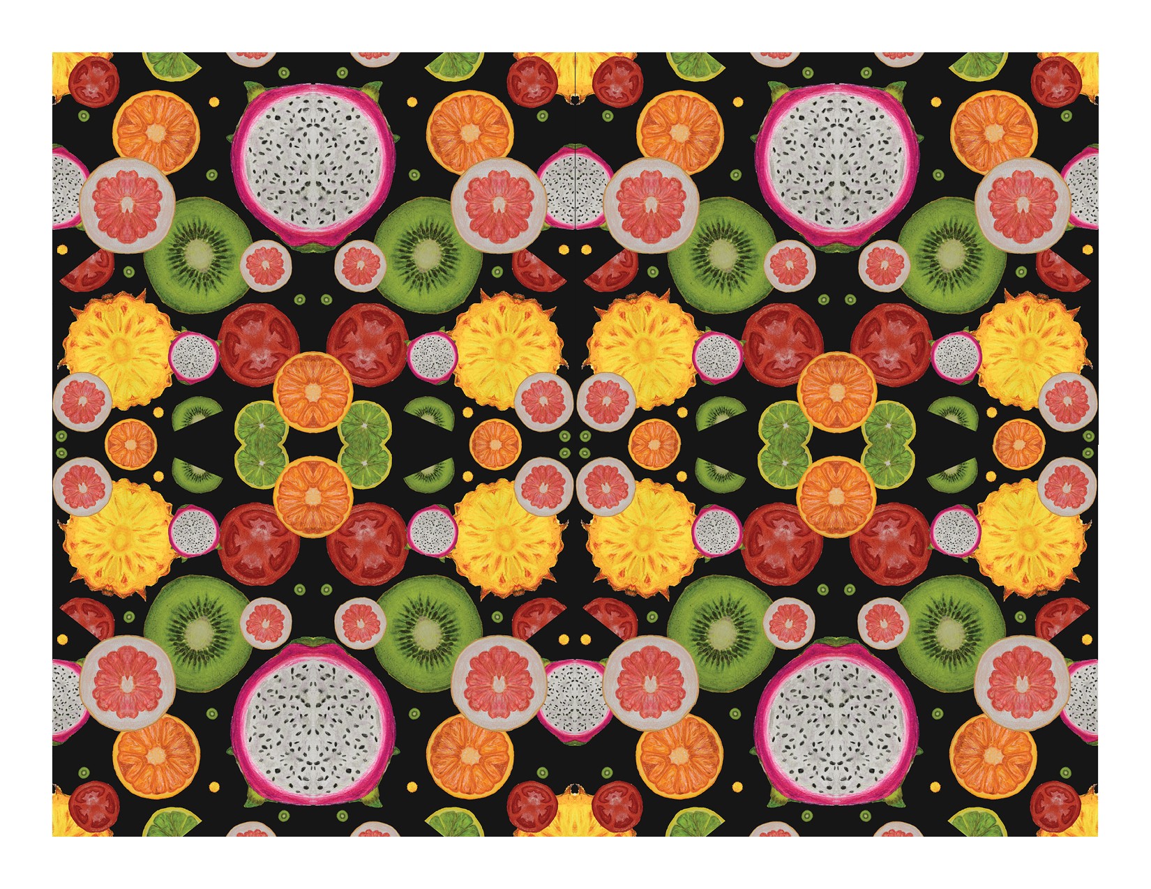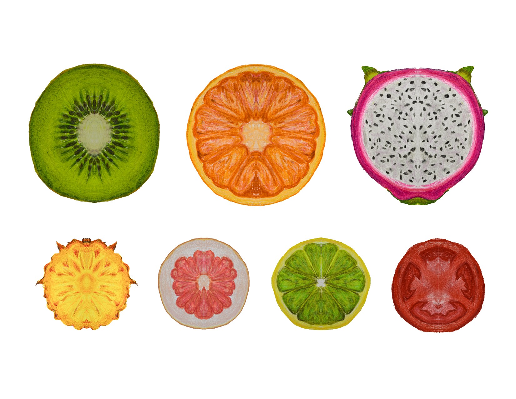 In this project, I sliced open various fruits, observing and capturing their intricate details via colored pencil drawings. I later photographed these drawings and digitally transformed them into a cohesive pattern.